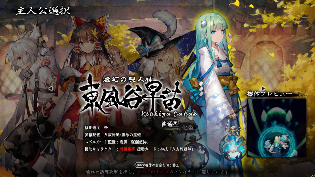 사나에의 경우 확산샷+유도형 서펜트 탄과 전방형 샷+식신공격(유도형)으로 교체가 가능하더군요.