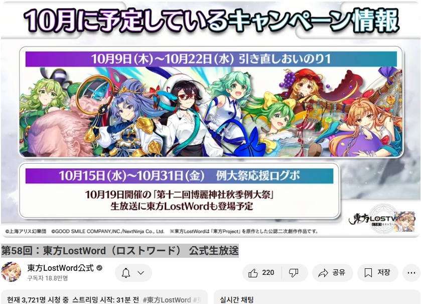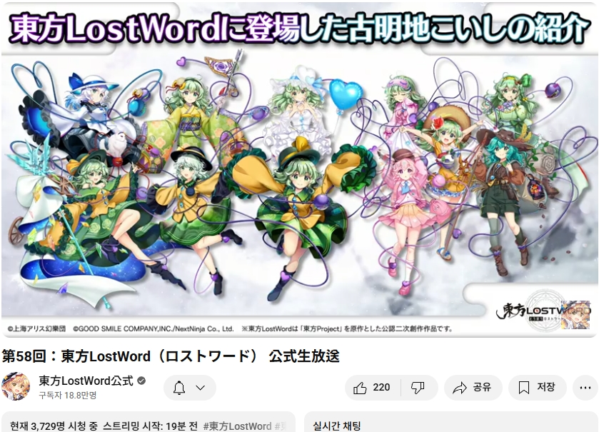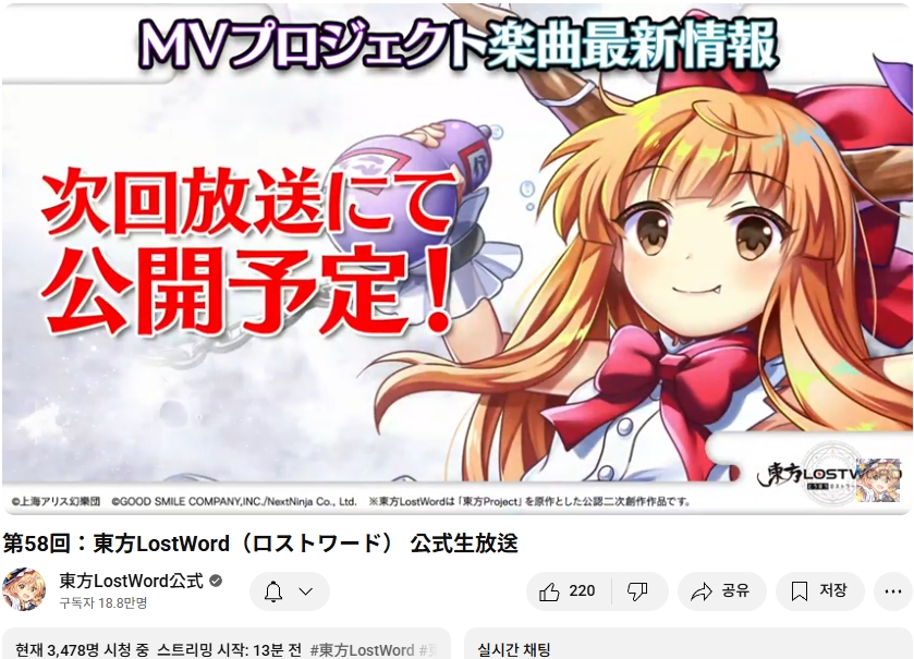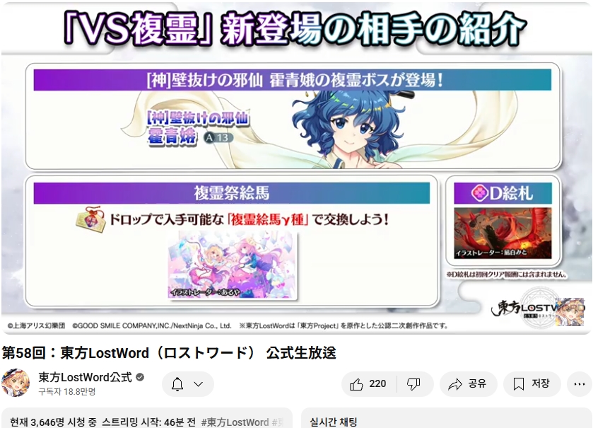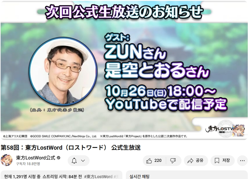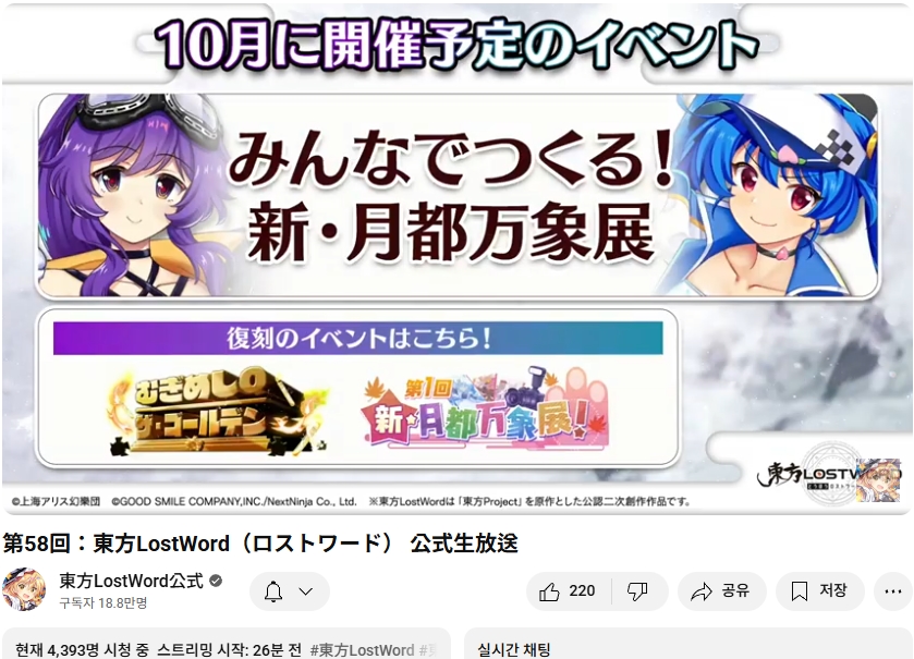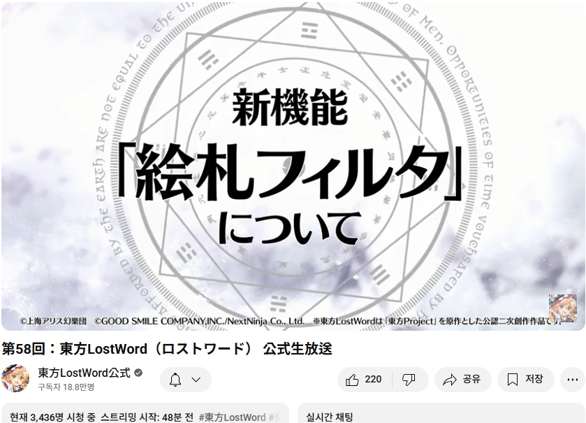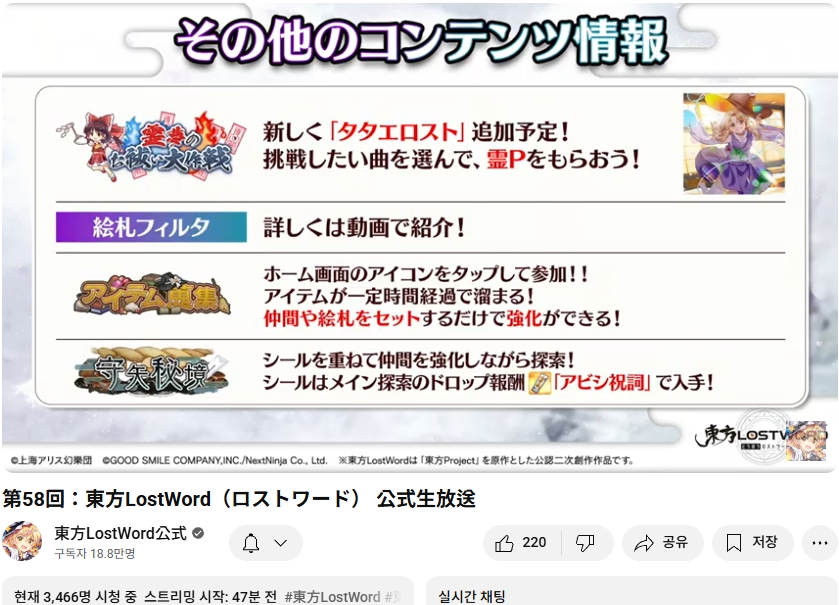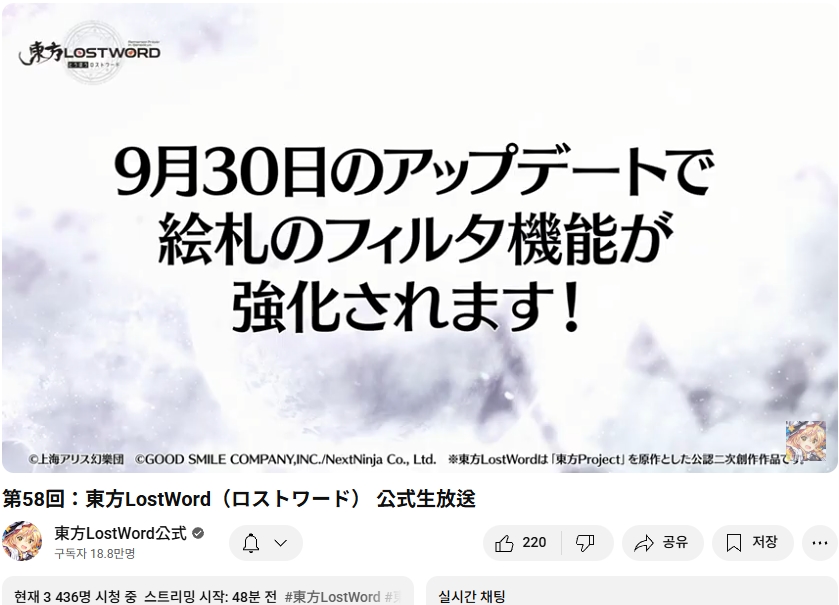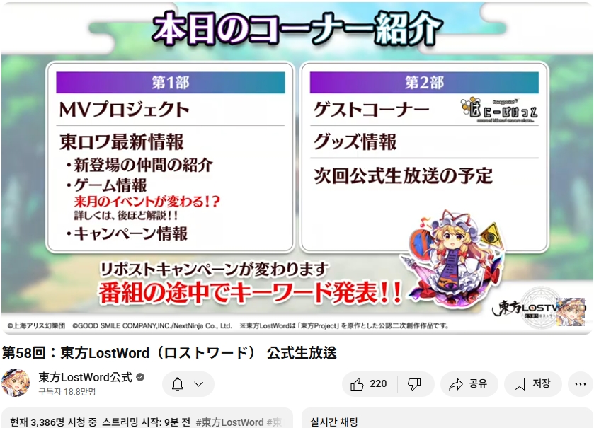 오늘인 9월 29일 (월) 19시부터 동방로스트워드의 업데이트 정보 등을 다루는 생방송이 실시되었습니다.