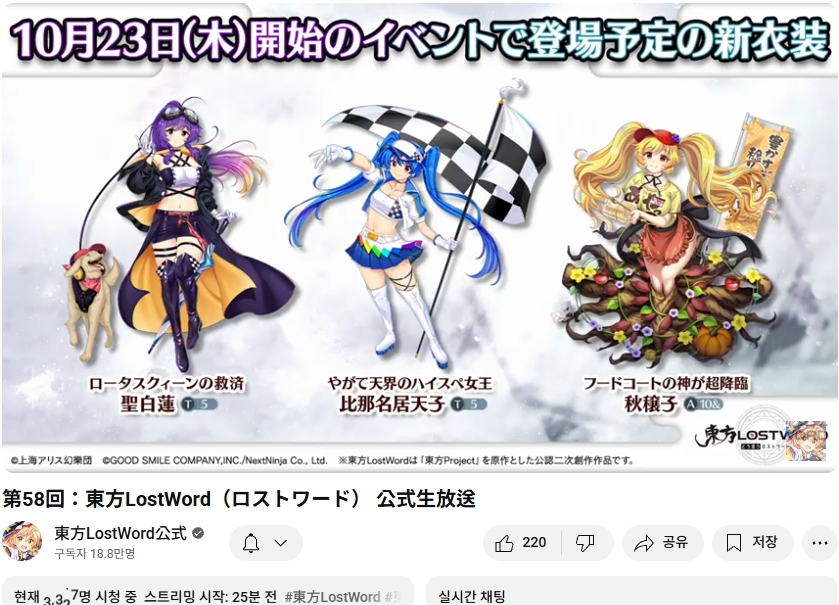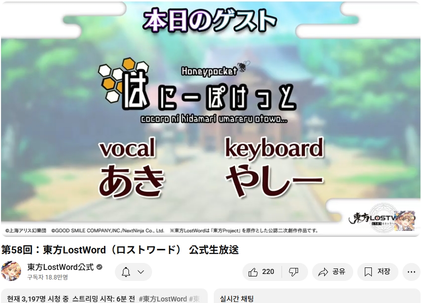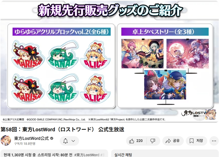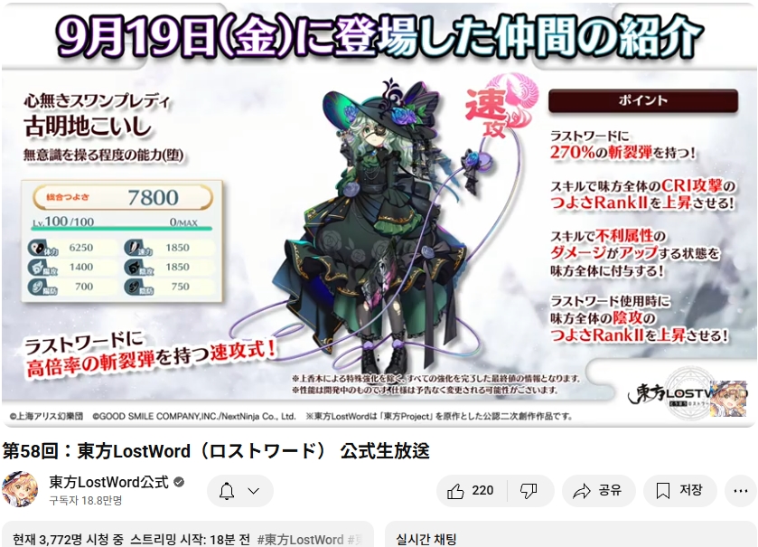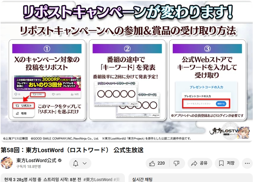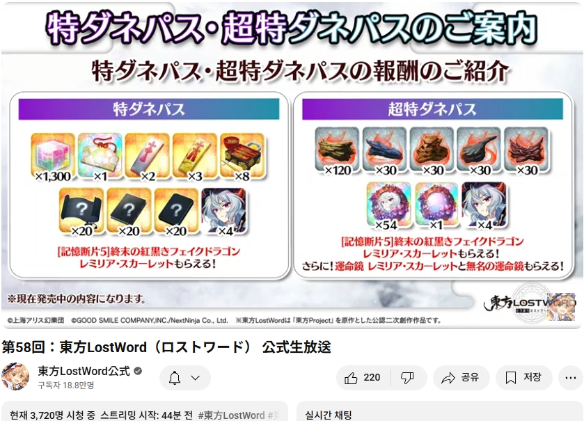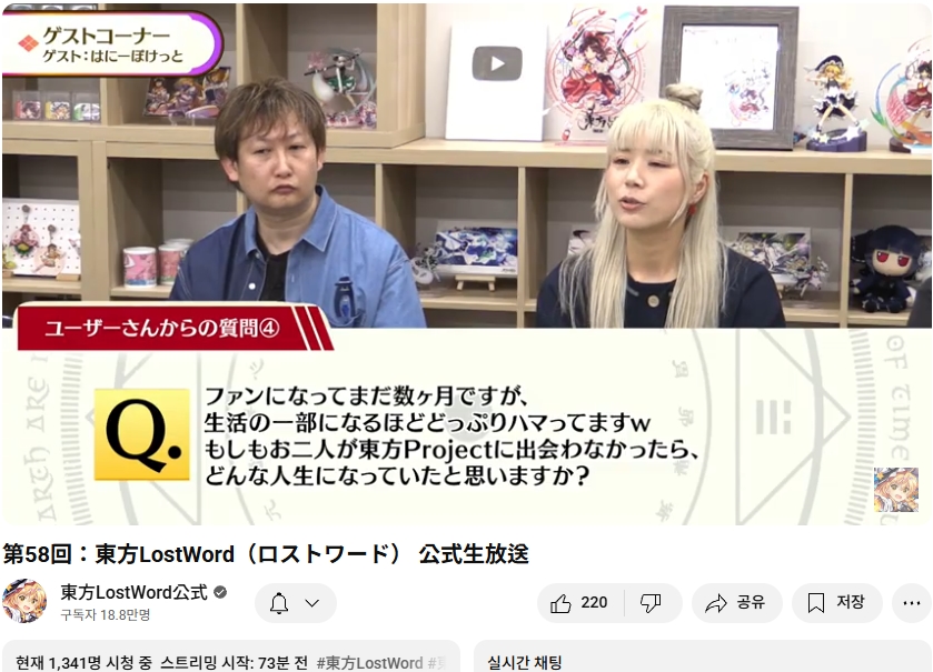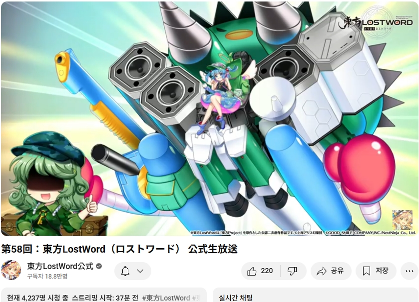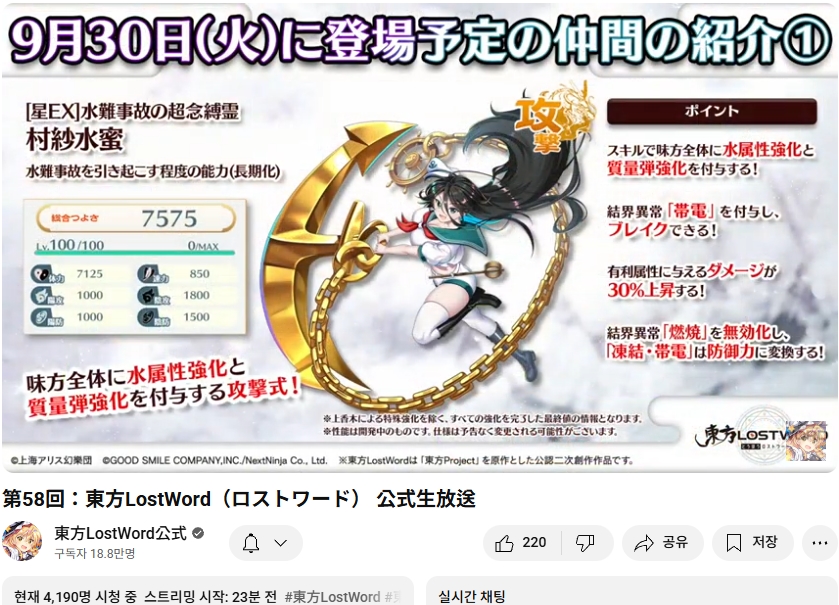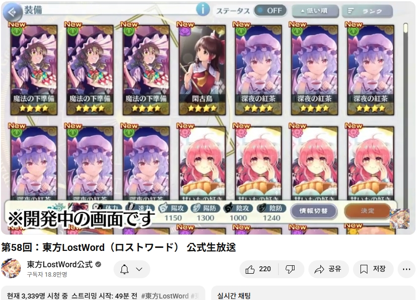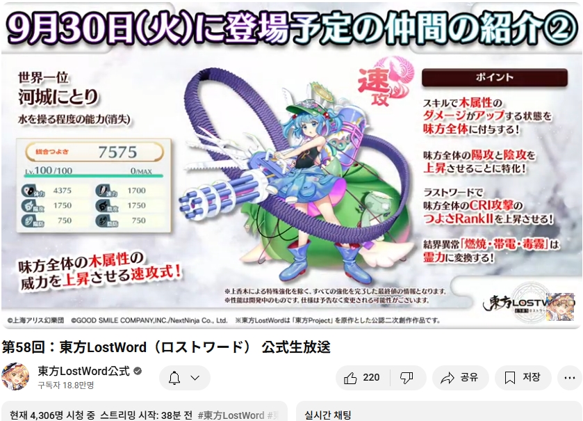 오늘인 9월 29일 (월) 19시부터 동방로스트워드의 업데이트 정보 등을 다루는 생방송이 실시되었습니다.