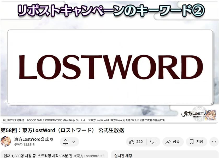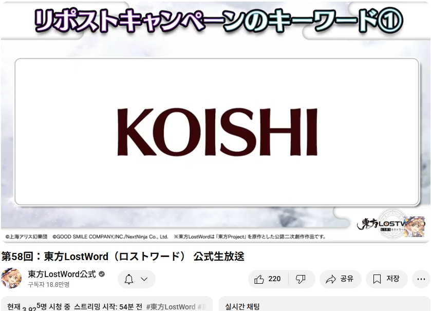 선물 증정 코드 LOSTWORDSTORE 및 RT 캠페인 키워드(1) KOISHI (2) LOSTWORD