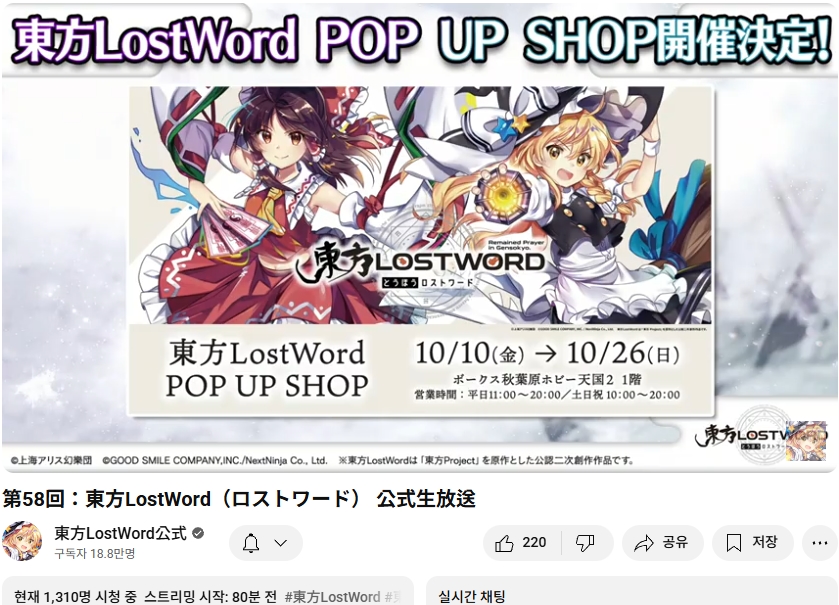 동방로스트워드 팝업 스토어 개최 결정 소식