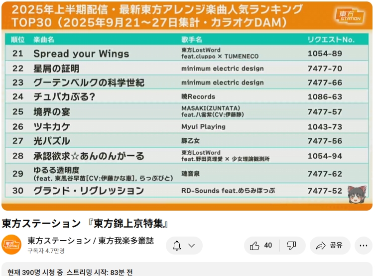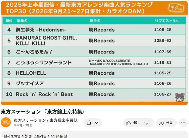 또한 인기 코너 동방 가라오케 카운트다운 powered by DAM 라거나