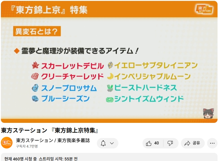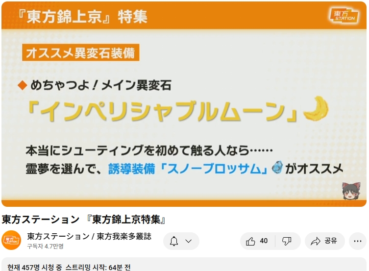 이번은 '동방금상경 특집' 편 방송으로, 금상경 발매(8월)로부터 시간이 좀 지났는지라 금상경 특집으로 전 캐릭터도 다룰 수 있게 된 느낌입니다.