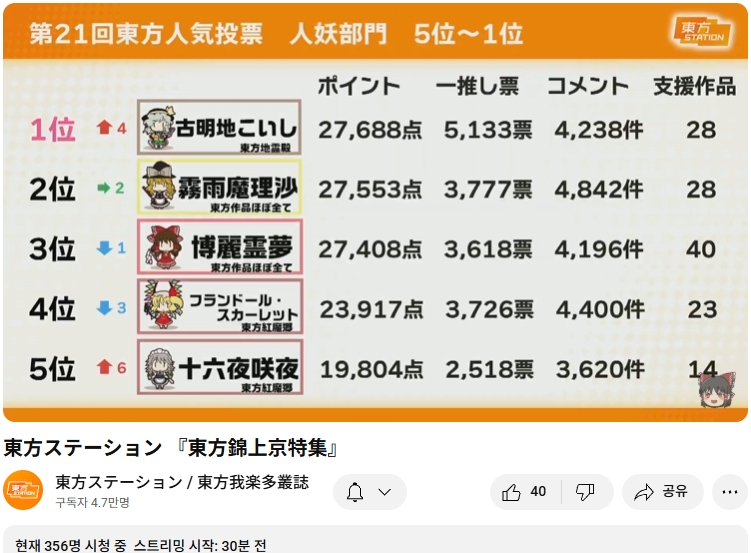 1위 코이시와 2위 마리사, 3위 레이무가 거의 차이가 없는 것을 볼 수 있습니다. 초접전...