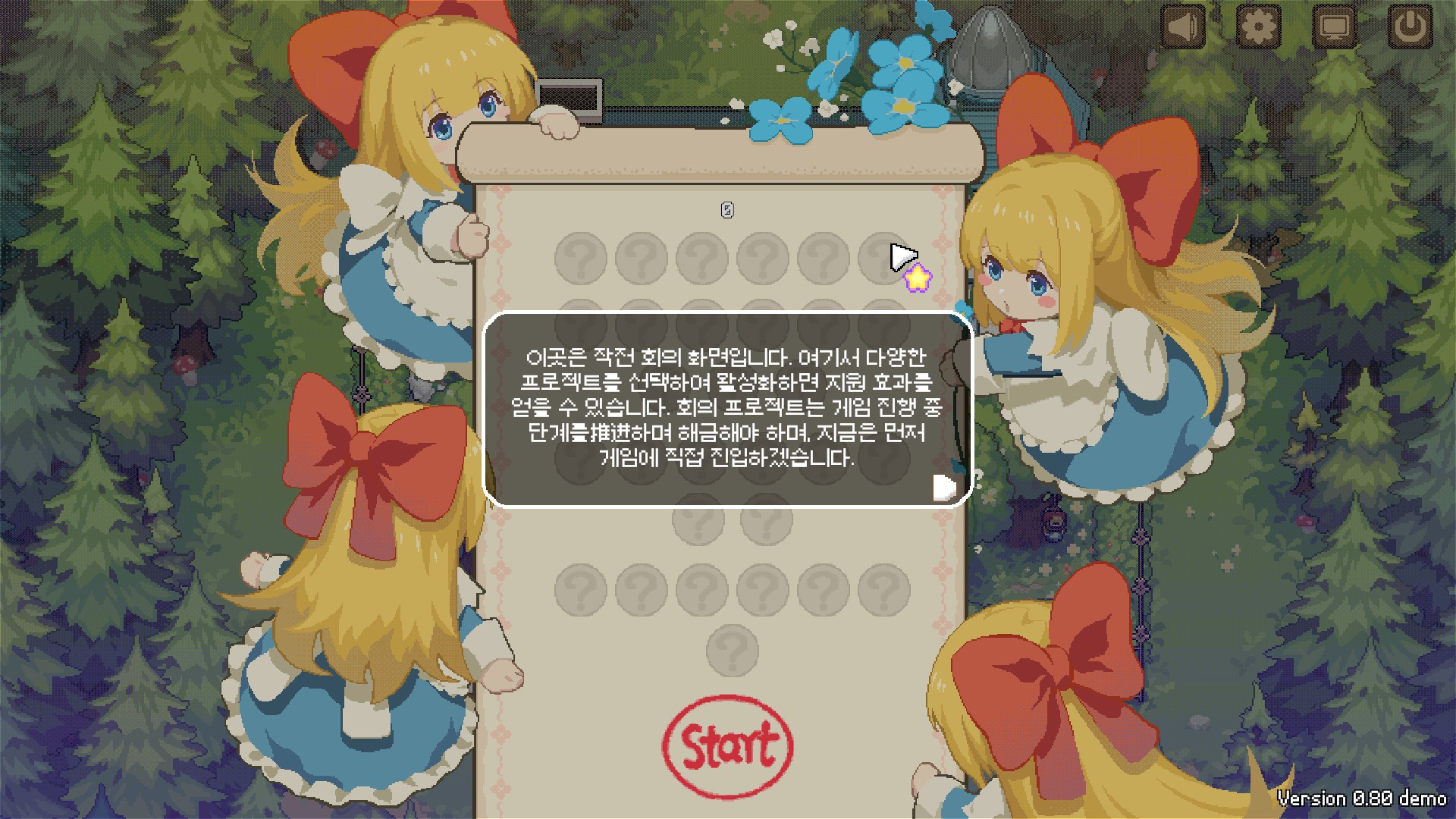 마리사가 빼앗아간 책을 되찾기 위해 우리는 마리사 집의 문을 뚫어야 합니다. 환상향의 용사들은 이미 집결했지만, 마리사 집은 방어가 견고하고 우리 인력은 부족합니다. 앨리스에게서 상해인형(상하이인형)을 만들기 시작하고, 이들을 각기 다른 인물의 특징을 가진 인형으로 변화시켜야 합니다. 각 인물마다 다른 인형은 모두 자신만의 독특한 공격 방식과 특색 있는 스킬을 가지고 있습니다.
