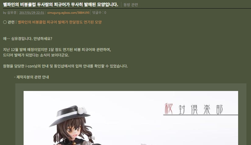 (10월경에 열린 홍루몽과 추계예대제에서 아키바 하비 부스에 전시된 벨파인의 피규어 전시 모습과 재판 소식)