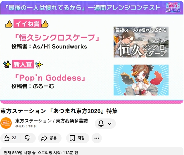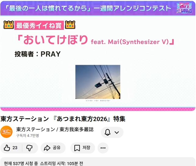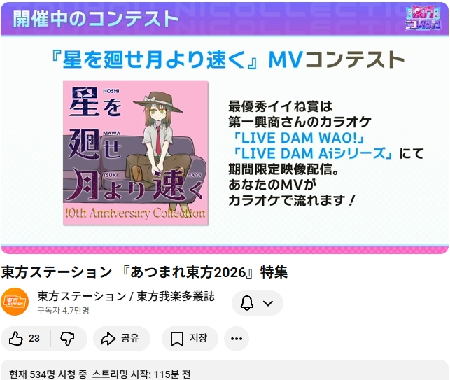 동방 어레인지 악곡의 MV 를 만드는 주제로, 최우수 좋아요상은 DAM 쪽으로 기간한정 영상 송출 예정이라고