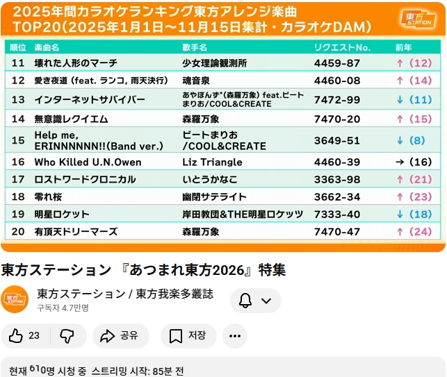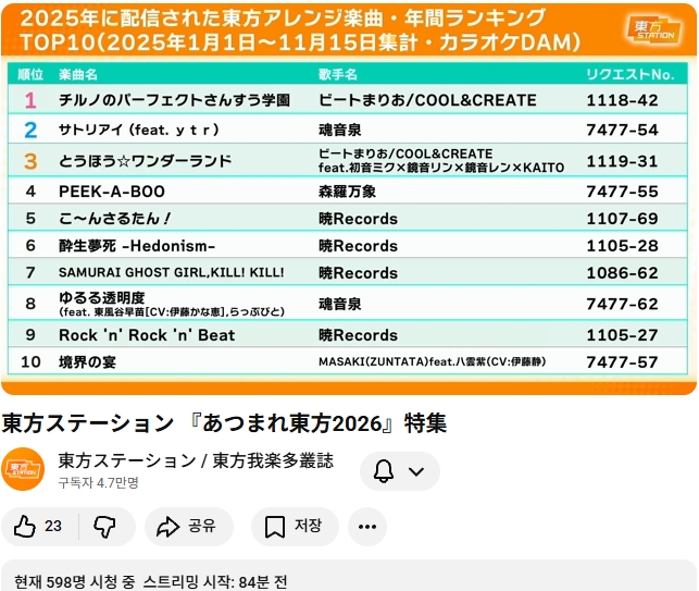 2025년 신곡들 중 한해간의 동방 악곡 랭킹, 1위가 산수교실 입니다.