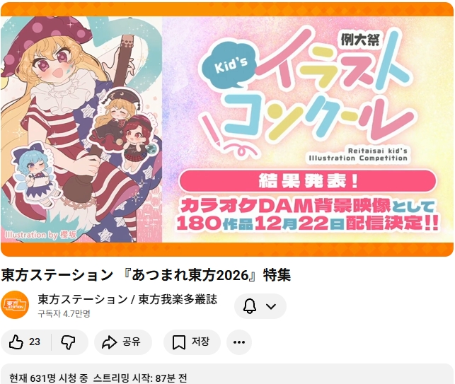 한편, 이전에 열린 어린이 동방 일러스크 콩클의 수살작들을 DAM 동방 악곡 배경영상으로 볼 수 있다고