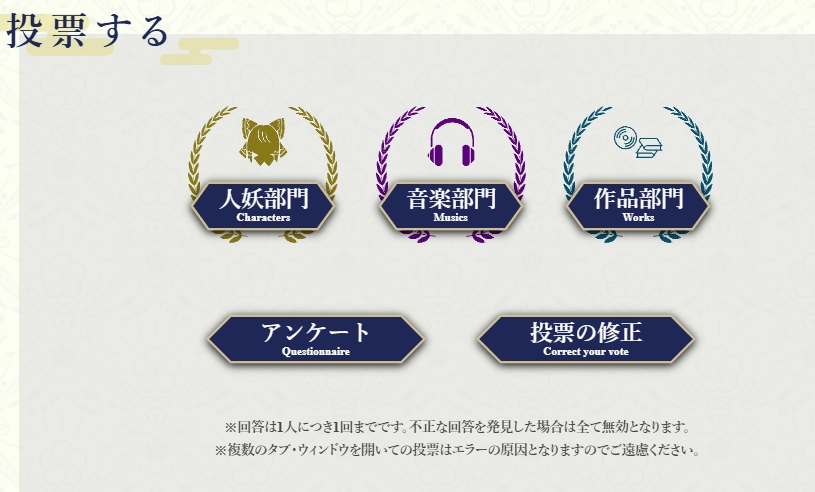 윗 줄의 3개가 각 부문 (캐릭터 부문 / 음악 부문 / 작품 부문) 의 투표 페이지이고