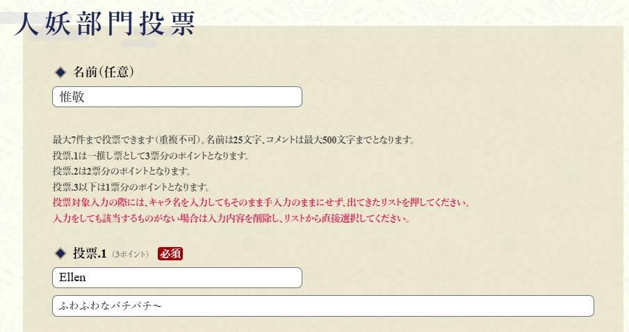 그 아래로 투표1번 캐릭터 선택창, 투표자 코멘트 입력란이 있습니다.
